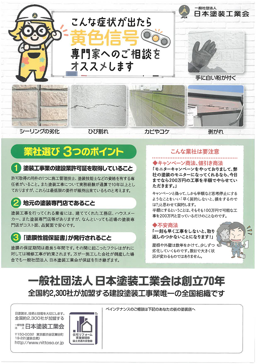 また、保証期間中(最長5年)に塗膜のフクレや剥がれが起きた場合は補修工事を行います。万が一、塗替え工事を行った塗装店が倒産した場合でも、(一社)日本塗装工業会が保証を引き継ぎます。